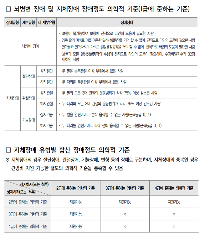 '지체장애 또는 뇌병변장애 중 ‘장애 정도가 심한 경우’에만 해당됩니다. - 예전 기준으로는 1급 수준에 해당해야 하며,