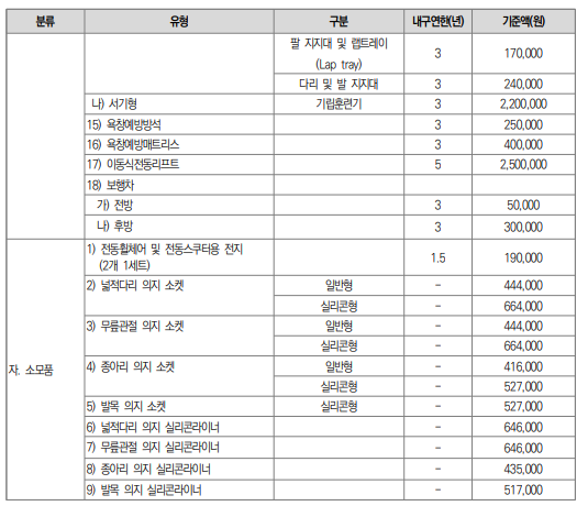 – 구매가 아닌 대여료를 월 단위로 지원, 일부 품목은 신청 시 의사진단서 필요