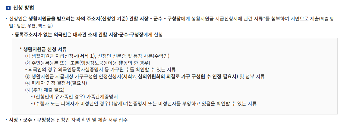 - 생활지원금 신청서 (지자체 홈페이지에서 다운로드 가능)